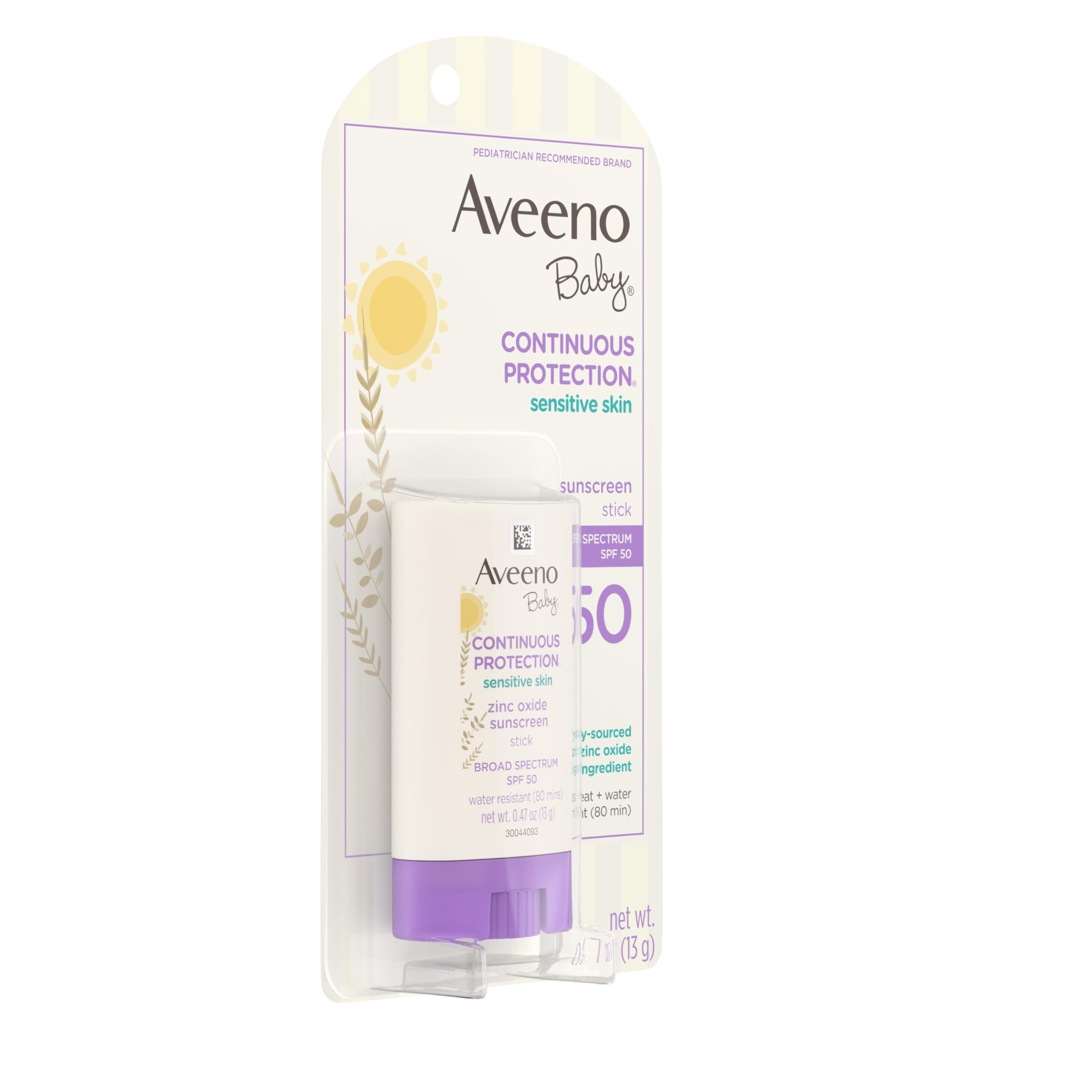 - 0.47-ounce stick of Aveeno Baby Continuous Protection Sensitive Skin Mineral Sunscreen Stick with Broad Spectrum SPF 50 in a convenient, travel size for on-the-go broad spectrum protection from harmful UVA and UVB rays for your little one's skin