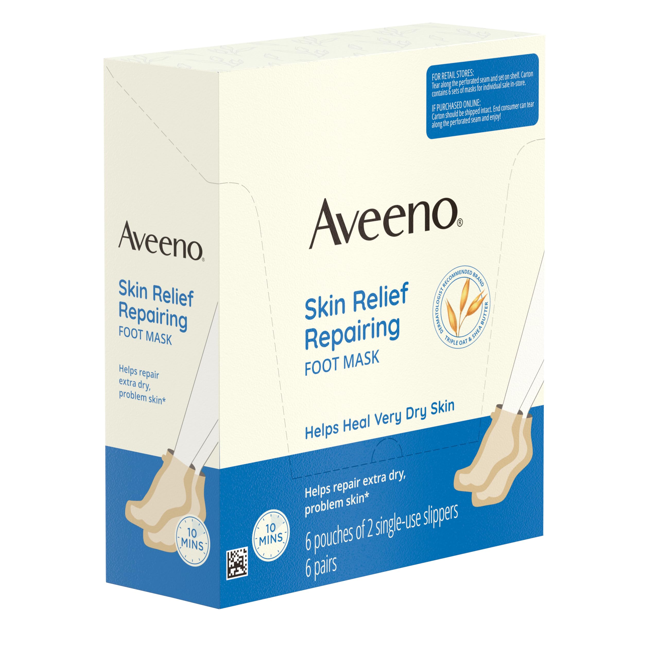 - Value pack of six pairs of Aveeno Skin Relief Repairing Foot Masks, single use moisturizing slippers formulated with triple oat and shea butter to help heal very dry skin in 10 minutes